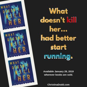 Today’s #FLF is from my current read: WHAT DOESN’T KILL HER by Christina Dodd. (Publishes January 29, 2019) It’s the second book in the series and it’s considered Romantic Suspense. Ms. Dodd is a new to me author with a backlist of almost 60 BOOKS!