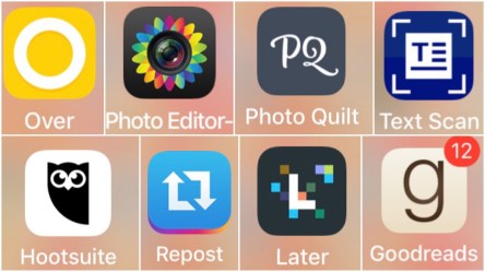 – the various apps and websites I use for blogging and social media… they make me look good! I use Over, Goodreads, Hootsuite, Later, Photo Editor, Text Scan, Repost on a daily basis!